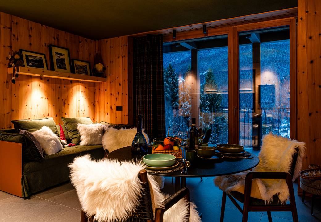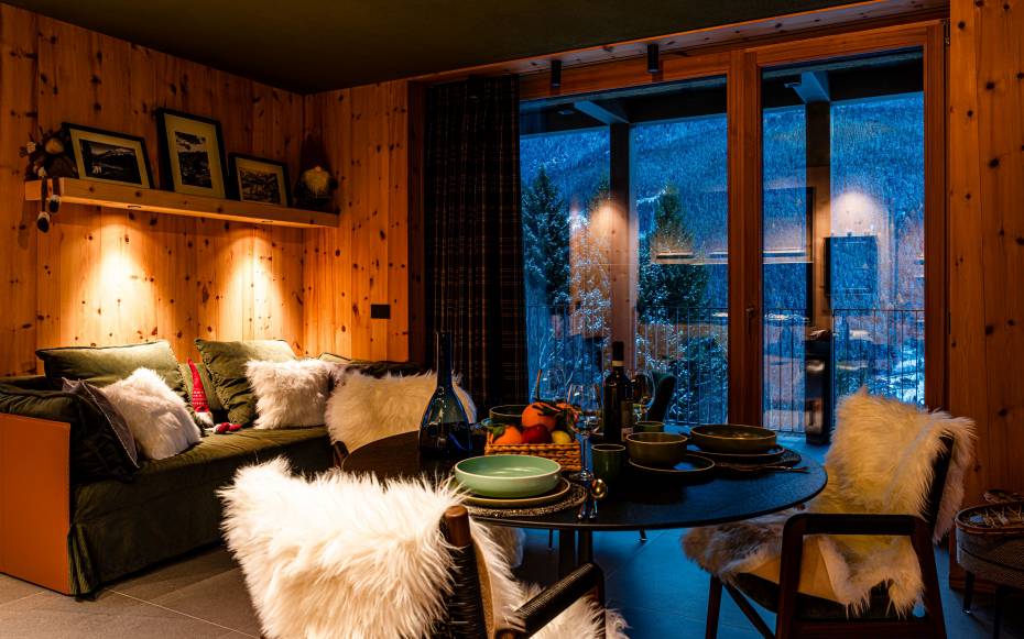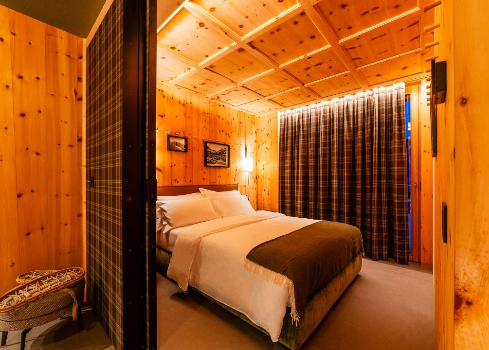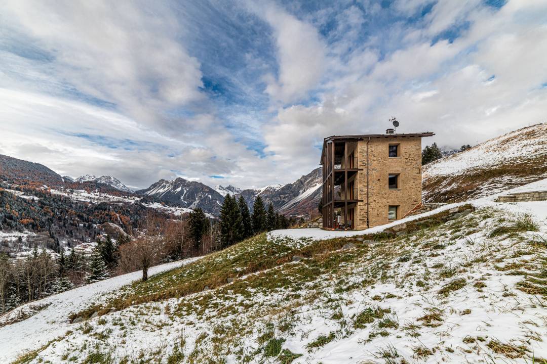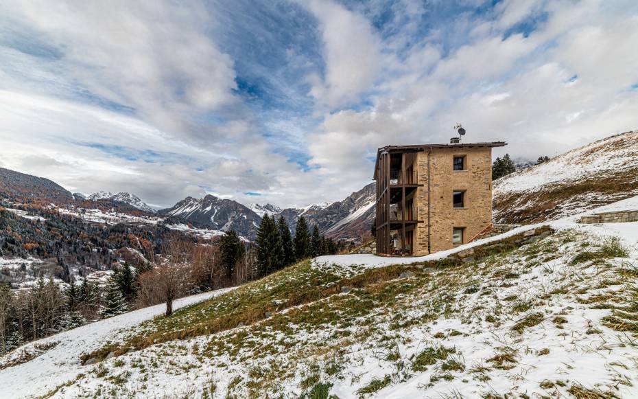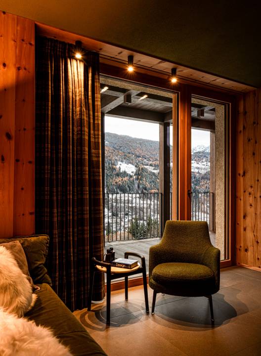 Nel fabbricato dell’Ottocento completamente rinnovato nel 2022, la storicità è stata preservata valorizzando i materiali locali, come il legno di larice del monte Reit di Bormio che riveste le pareti interne, e le fonti energetiche naturali con l’utilizzo di fotovoltaico, ricambio controllato dell’aria interna e biomassa. Il mood degli interni è ispirato alla semplicità delle case di montagna con contaminazioni di design, arredi Flexform e pezzi dei più prestigiosi designer contemporanei come Antonio Citterio e Gio Ponti.